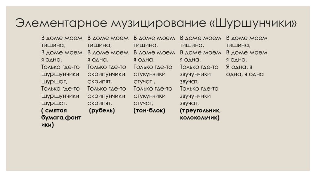 В доме моем тишина, В доме моем я одна. Только где-то шуршунчики шуршат, Только где-то шуршунчики шуршат. ( смятая бумага,фантики ) В доме моем тишина, В доме моем я одна. Только где-то скрипунчики скрипят, Только где-то скрипунчики скрипят. (рубель) В доме моем тишина, В доме моем я одна. Только где-то стукунчики стучат, Только где-то стукунчики стучат, (тон-блок) В доме моем тишина, В доме моем я одна. Только где-то звучунчики звучат, Только где-то звучунчики звучат, ( треугольник,колокольчик ) В доме моем тишина, В доме моем я одна. Я одна, я одна, я одна