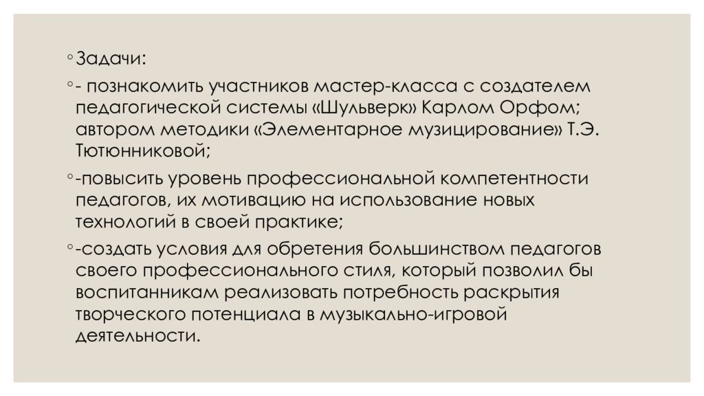 Задачи: - познакомить участников мастер-класса с создателем педагогической системы « Шульверк » Карлом Орфом ; автором методики «Элементарное музицирование » Т.Э. Тютюнниковой ; -повысить уровень профессиональной компетентности педагогов, их мотивацию на использование новых технологий в своей практике; -создать условия для обретения большинством педагогов своего профессионального стиля, который позволил бы воспитанникам реализовать потребность раскрытия творческого потенциала в музыкально-игровой деятельности.