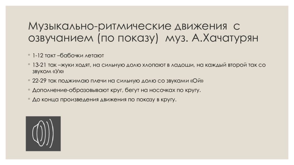 Слайд 10: Музыкально-ритмические движения с озвучанием (по показу) муз. А.Хачатурян