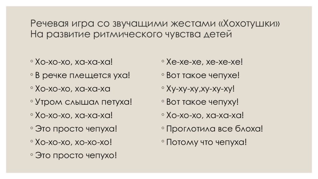 Слайд 8: Речевая игра со звучащими жестами «Хохотушки» На развитие ритмического чувства детей