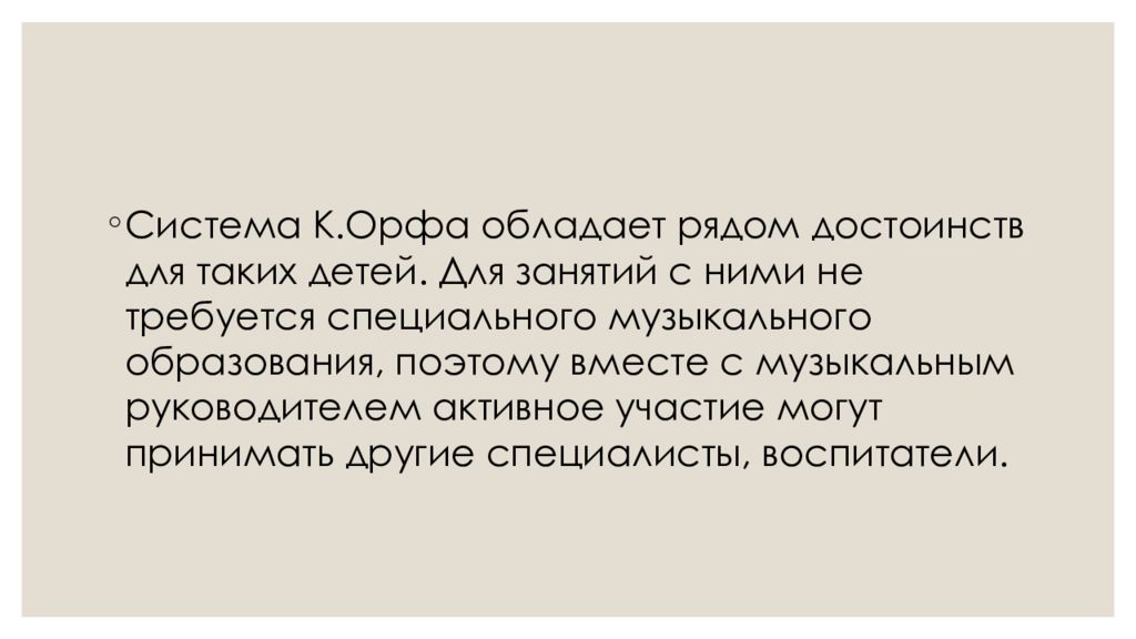 Система К.Орфа обладает рядом достоинств для таких детей. Для занятий с ними не требуется специального музыкального образования, поэтому вместе с музыкальным руководителем активное участие могут принимать другие специалисты, воспитатели.