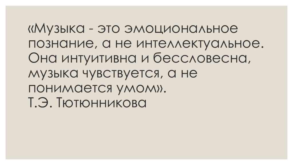 Слайд 2: Музыка - это эмоциональное познание, а не интеллектуальное. Она интуитивна и бессловесна, музыка чувствуется, а не понимается умом». Т.Э. Тютюнникова