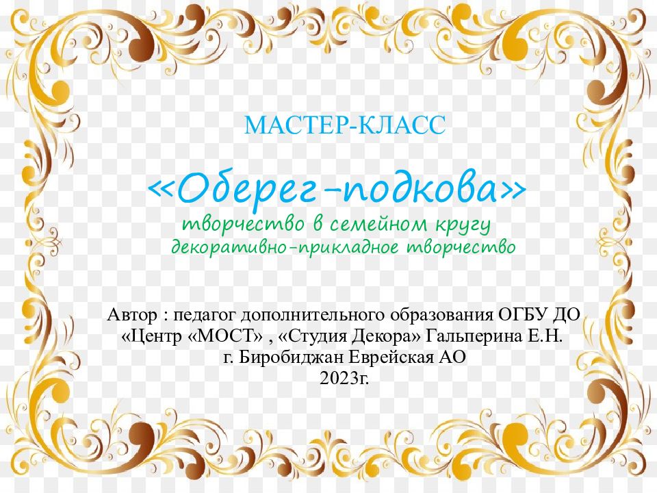 МАСТЕР-КЛАСС «Оберег-подкова» творчество в семейном кругу декоративно-прикладное творчество Автор : педагог дополнительного образования ОГБУ ДО «Центр «МОСТ», «Студия Декора» Гальперина Е.Н. г. Биробиджан Еврейская АО 2023г.