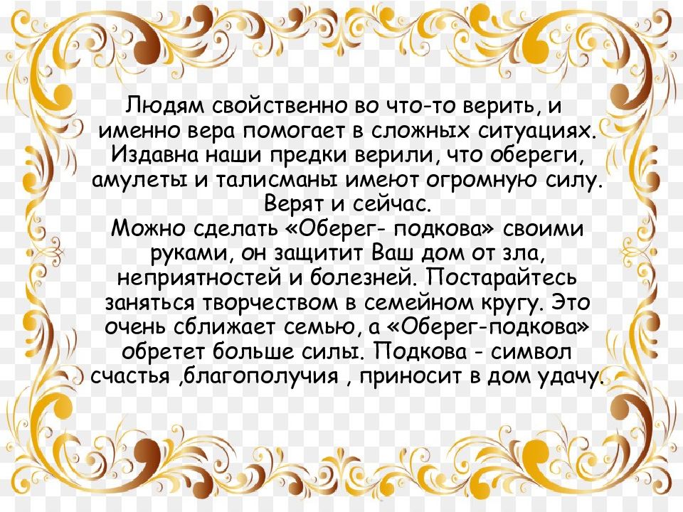 Людям свойственно во что-то верить, и именно вера помогает в сложных ситуациях. Издавна наши предки верили, что обереги, амулеты и талисманы имеют огромную силу. Верят и сейчас. Можно сделать «Оберег- подкова» своими руками, он защитит Ваш дом от зла, неприятностей и болезней. Постарайтесь заняться творчеством в семейном кругу. Это очень сближает семью, а «Оберег-подкова» обретет больше силы. Подкова - символ счастья,благополучия, приносит в дом удачу.