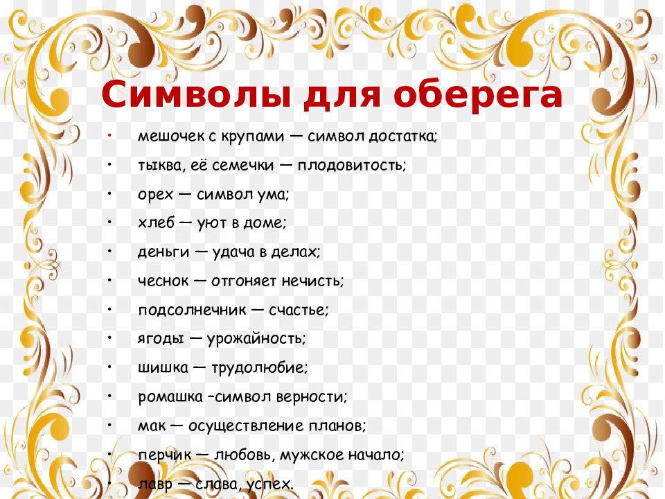 • мешочек с крупами — символ достатка; • тыква, её семечки — плодовитость; • орех — символ ума; • хлеб — уют в доме; • деньги — удача в делах; • чеснок — отгоняет нечисть; • подсолнечник — счастье; • ягоды — урожайность; • шишка — трудолюбие; • ромашка –символ верности; • мак — осуществление планов; • перчик — любовь, мужское начало; • лавр — слава, успех. Символы для оберега