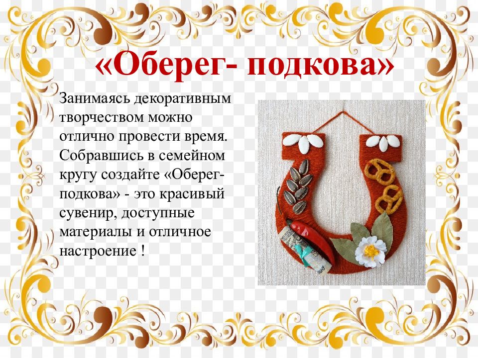 Занимаясь декоративным творчеством можно отлично провести время. Собравшись в семейном кругу создайте «Оберег- подкова» - это красивый сувенир, доступные материалы и отличное настроение ! «Оберег- подкова»