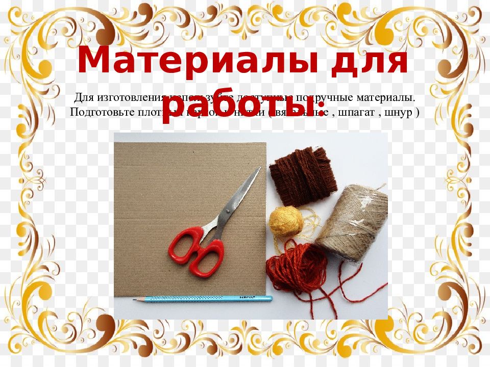 Для изготовления используйте доступные подручные материалы. Подготовьте плотный картон и нитки ( вязальные, шпагат, шнур ) Материалы для работы: