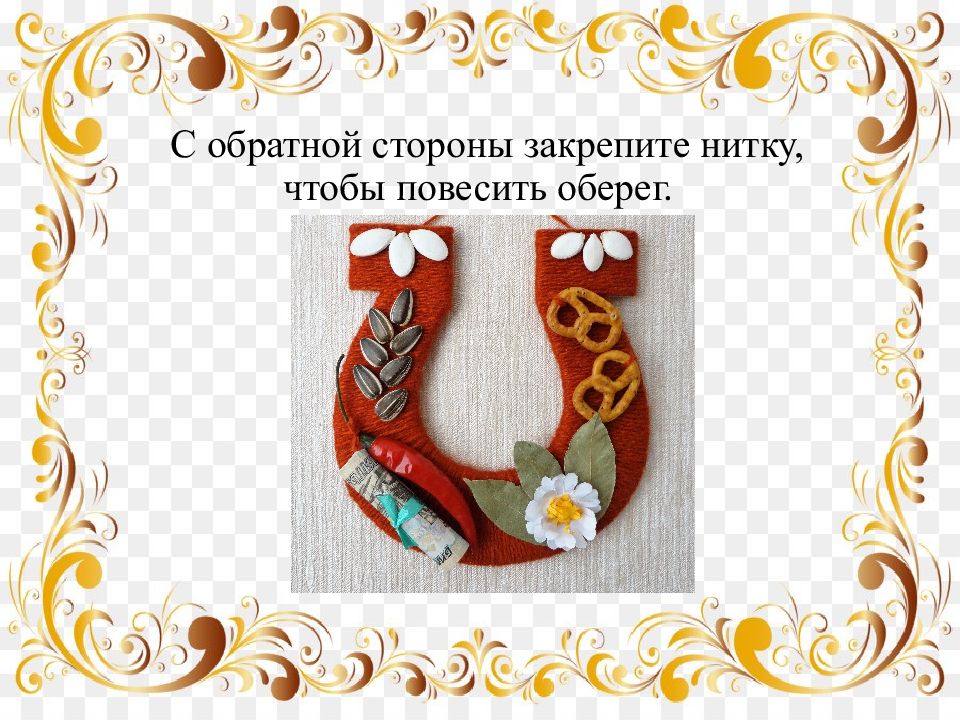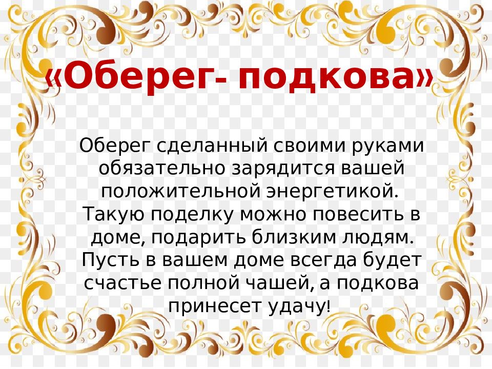 « Оберег- подкова» Оберег сделанный своими руками обязательно зарядится вашей положительной энергетикой. Такую поделку можно повесить в доме, подарить близким людям. Пусть в вашем доме всегда будет счастье полной чашей, а подкова принесет удачу!