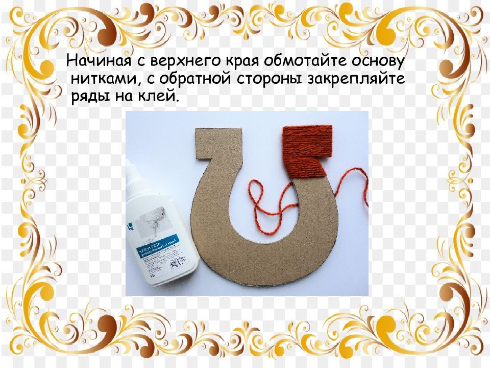Начиная с верхнего края обмотайте основу нитками, с обратной стороны закрепляйте ряды на клей.
