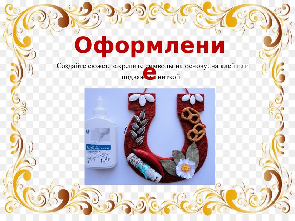 Создайте сюжет, закрепите символы на основу: на клей или подвяжите ниткой. Оформление