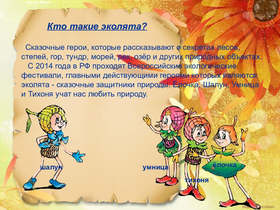 Кто такие эколята? Сказочные герои, которые рассказывают о секретах лесов, степей, гор, тундр, морей, рек, озёр и других природных объектах. С 2014 года в РФ проходят Всероссийские экологические фестивали, главными действующими героями которых являются эколята - сказочные защитники природы. Ёлочка, Шалун, Умница и Тихоня учат нас любить природу. ёлочка шалун умница тихоня