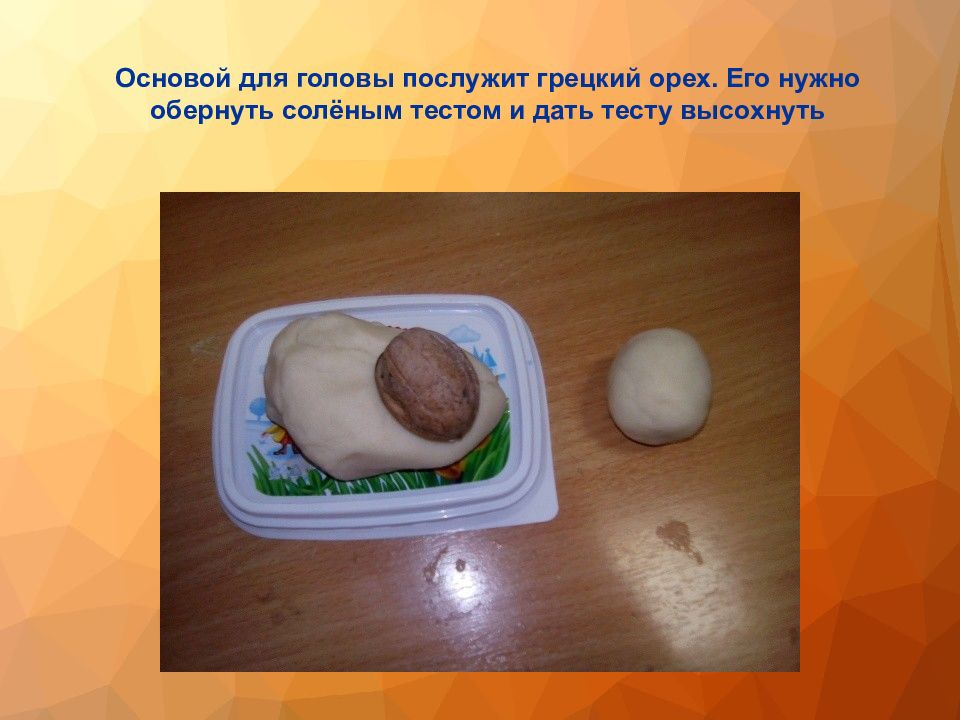 Основой для головы послужит грецкий орех. Его нужно обернуть солёным тестом и дать тесту высохнуть
