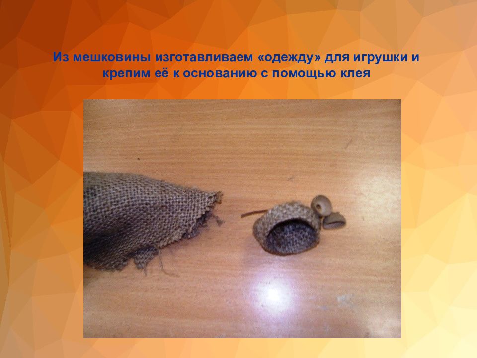 Из мешковины изготавливаем «одежду» для игрушки и крепим её к основанию с помощью клея