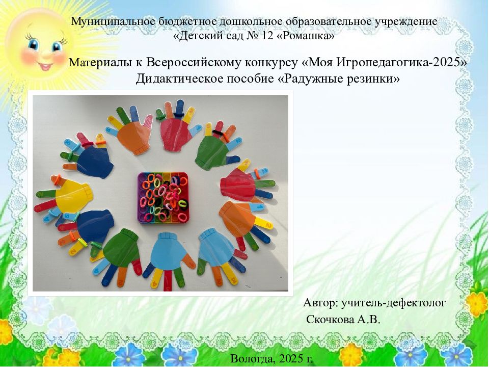 Автор: учитель-дефектолог Скочкова А.В. Мат ериалы к Всероссийскому конкурсу «Моя Игропедагогика-2025 » Дидактическое пособие «Радужные резинки» Муниципальное бюджетное дошкольное образовательное учреждение «Детский сад № 12 «Ромашка» Вологда, 2025 г.
