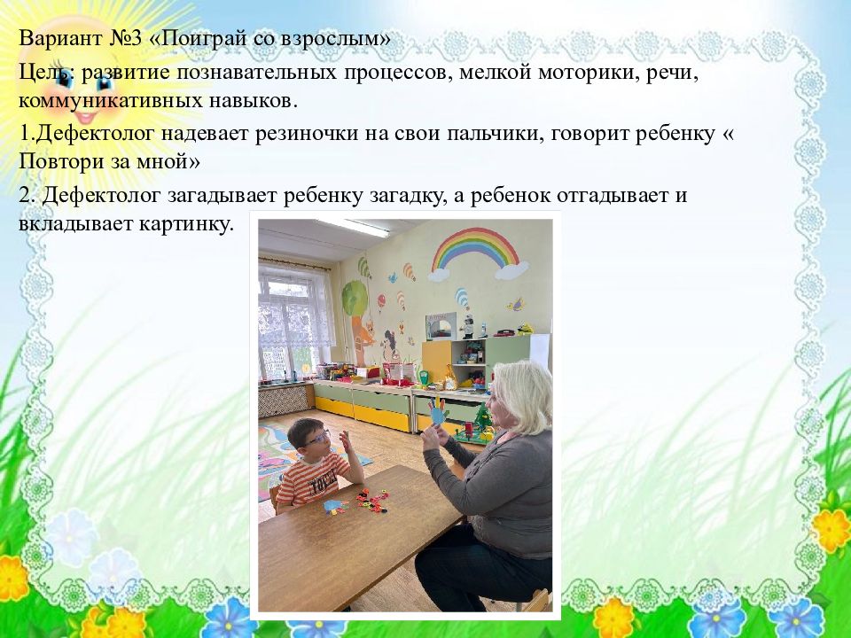 Вариант №3 «Поиграй со взрослым» Цель: развитие познавательных процессов, мелкой моторики, речи, коммуникативных навыков. 1.Дефектолог надевает резиночки на свои пальчики, говорит ребенку « Повтори за мной» 2. Дефектолог загадывает ребенку загадку, а ребенок отгадывает и вкладывает картинку.