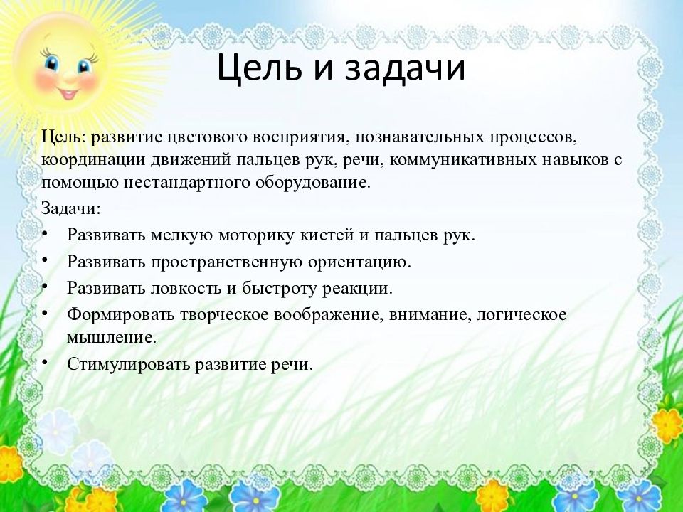 Цель: развитие цветового восприятия, познавательных процессов, координации движений пальцев рук, речи, коммуникативных навыков с помощью нестандартного оборудование. Задачи: Развивать мелкую моторику кистей и пальцев рук. Развивать пространственную ориентацию. Развивать ловкость и быстроту реакции. Формировать творческое воображение, внимание, логическое мышление. Стимулировать развитие речи.