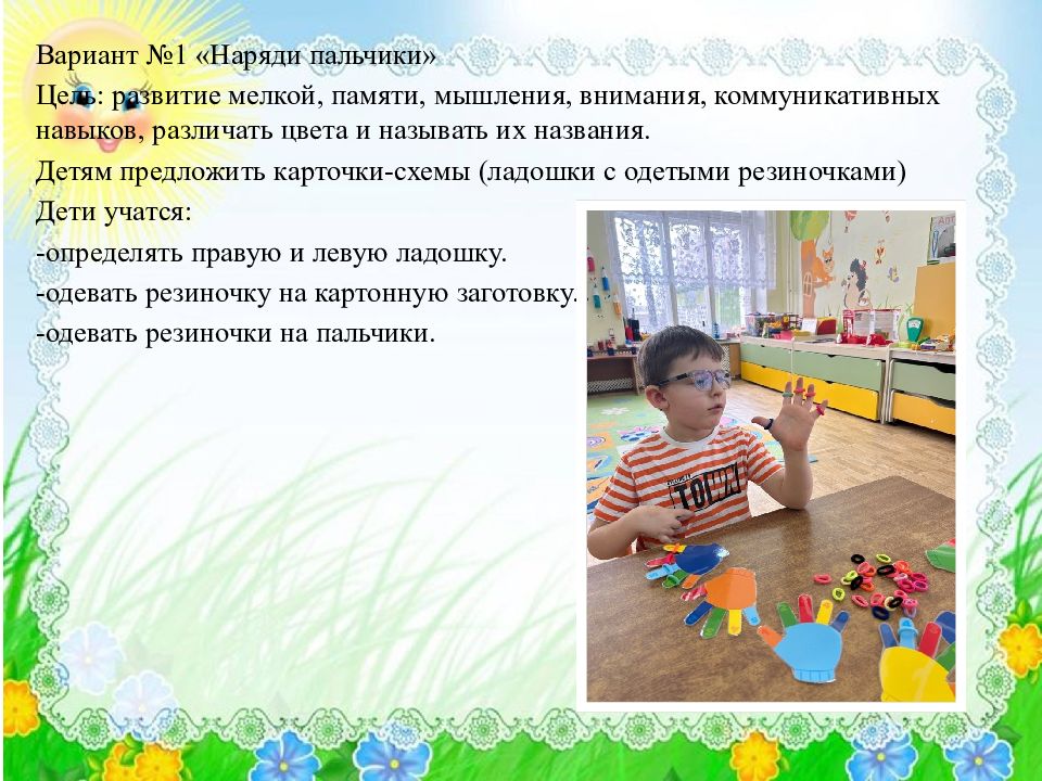Вариант №1 «Наряди пальчики» Цель: развитие мелкой, памяти, мышления, внимания, коммуникативных навыков, различать цвета и называть их названия. Детям предложить карточки-схемы (ладошки с одетыми резиночками ) Дети учатся: -определять правую и левую ладошку. -одевать резиночку на картонную заготовку. -одевать резиночки на пальчики.