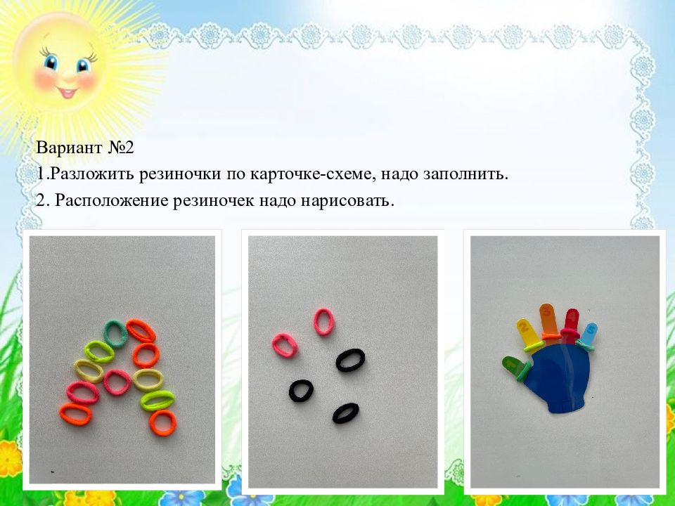 Вариант №2 1.Разложить резиночки по карточке-схеме, надо заполнить. 2. Расположение резиночек надо нарисовать.