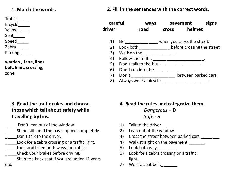 1. Match the words. Traffic_____ Bicycle_____ Yellow_____ Seat_____ Speed_____ Zebra______ Parking______ warden, lane, lines belt, limit, crossing, zone 2. Fill in the sentences with the correct words. careful ways pavement signs driver road cross helmet Be ______________ when you cross the street. Look both _____________ before crossing the street. Walk on the ______________. Follow the traffic ______________________. Don`t talk to the bus __________________. Don`t run into the _________________. Don`t ___________________ between parked cars. Always wear a bicycle ____________________. 3. Read the traffic rules and choose those which tell about safety while travelling by bus. _____ Don’t lean out of the window. _____Stand still until the bus stopped completely. _____Don`t talk to the driver. _____Look for a zebra crossing or a traffic light. _____Look and listen both ways for traffic. _____Check your brakes before driving. _____Sit in the back seat if you are under 12 years old. Talk to the driver._____ Lean out of the window._______ Cross the street between parked cars.________ Walk straight on the pavement._______ Look both ways._______ Look for a zebra crossing or a traffic light._________ Wear a seat belt._______ 4. Read the rules and categorize them. Dangerous – D Safe - S