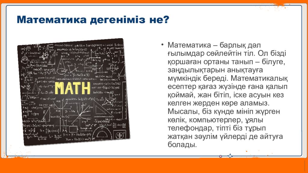 Математика – барлық дәл ғылымдар сөйлейтін тіл. Ол бізді қоршаған ортаны танып – білуге, заңдылықтарын анықтауға мүмкіндік береді. Математикалық есептер қағаз жүзінде ғана қалып қоймай, жан бітіп, іске асуын кез келген жерден көре аламыз. Мысалы, біз күнде мініп жүрген көлік, компьютерлер, ұялы телефондар, тіпті біз тұрып жатқан зәулім үйлерді де айтуға болады. 5 Математика дегеніміз не?