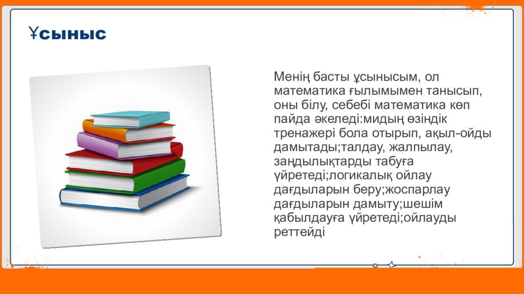 Менің басты ұсынысым, ол математика ғылымымен танысып, оны білу, себебі математика көп пайда әкеледі:мидың өзіндік тренажері бола отырып, ақыл-ойды дамытады;талдау, жалпылау, заңдылықтарды табуға үйретеді;логикалық ойлау дағдыларын беру;жоспарлау дағдыларын дамыту;шешім қабылдауға үйретеді;ойлауды реттейді 14 Ұсыныс