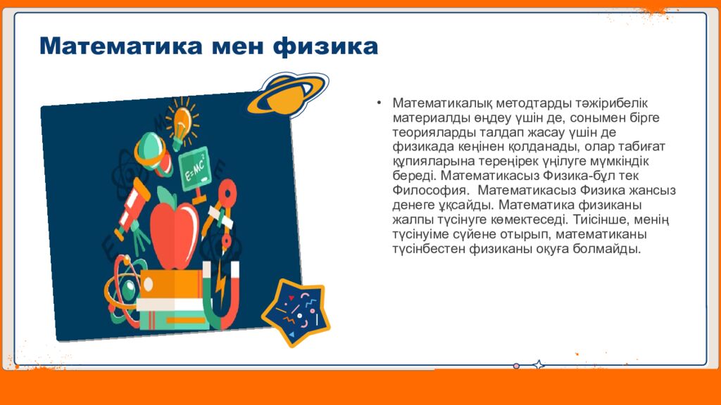 Математикалық методтарды тәжірибелік материалды өңдеу үшін де, сонымен бірге теорияларды талдап жасау үшін де физикада кеңінен қолданады, олар табиғат құпияларына тереңірек үңілуге мүмкіндік береді. Математикасыз Физика- бұл тек Философия. Математикасыз Физика жансыз денеге ұқсайды. Математика физиканы жалпы түсінуге көмектеседі. Тиісінше, менің түсінуіме сүйене отырып, математиканы түсінбестен физиканы оқуға болмайды. 7 Математика мен физика