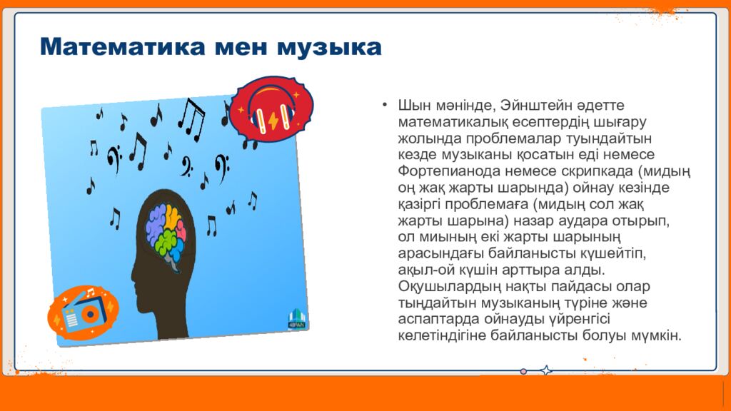 Шын мәнінде, Эйнштейн әдетте математикалық есептердің шығару жолында проблемалар туындайтын кезде музыканы қоса тын еді немесе Фортепианода немесе скрипкада ( мидың оң жақ жарты шарында ) ойнау кезінде қазіргі проблемаға ( мидың сол жақ жарты шарына ) назар аудара отырып, ол миының екі жарты шарының арасындағы байланысты күшейтіп, ақыл -ой күшін арттыра алды. Оқушылардың нақты пайдасы олар тыңдайтын музыканың түріне және аспаптарда ойнауды үйренгісі келетіндігіне байланысты болуы мүмкін. 12 Математика мен музыка