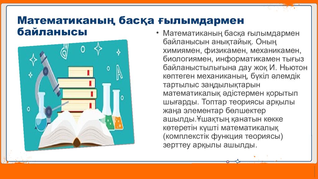 Математиканың нақты ғылымдар саласында алатын орны орасан зор. Математика – ғылымдардың іргетасы. Математикасыз физика, химия, тіптен биология салаларын елестету мүмкін емес. Математиканы кез келген ғылым саласына енгізсеңіз, оған жан бітіп, бойына қан жүгіреді. 4