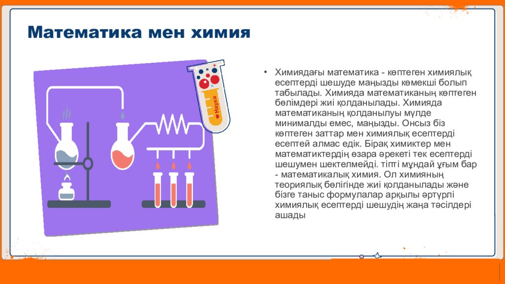 Химиядағы математика - көптеген химиялық есептерді шешуде маңызды көмекші болып табылады. Химияда математиканың көптеген бөлімдері жиі қолданылады. Химияда математиканың қолданылуы мүлде минималды емес, маңызды. Онсыз біз көптеген заттар мен химиялық есептерді есептей алмас едік. Бірақ химиктер мен математиктердің өзара әрекеті тек есептерді шешумен шектелмейді. тіпті мұндай ұғым бар - математикалық химия. Ол химияның теориялық бөлігінде жиі қолданылады және бізге таныс формулалар арқылы әртүрлі химиялық есептерді шешудің жаңа тәсілдері ашады 9 Математика мен химия