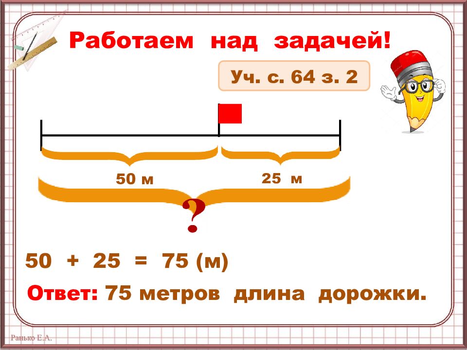 Уч. с. 64 з. 2 Ответ: 75 метров длина дорожки. 5 0 + 25 = 75 ( м ) 50 м 25 м