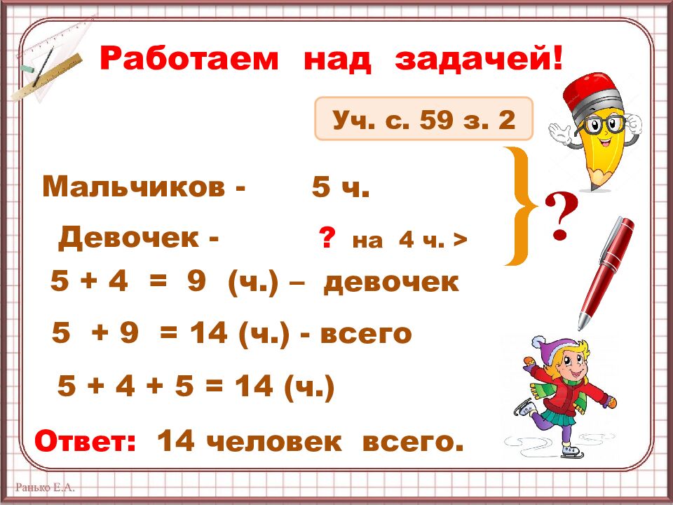 Уч. с. 59 з. 2 Мальчиков - Девочек - 5 ч. ? на 4 ч. > Ответ: 14 человек всего. 5 + 4 = 9 ( ч.) – девочек 5 + 9 = 14 ( ч.) - всего 5 + 4 + 5 = 14 ( ч.)