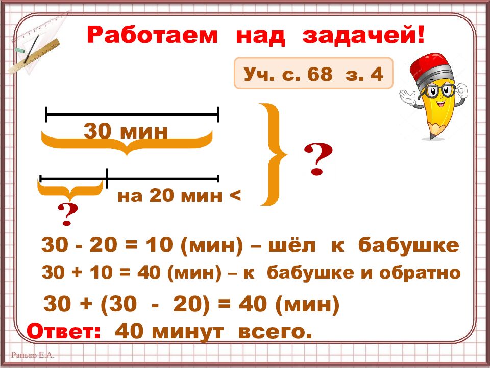 Уч. с. 68 з. 4 3 0 мин 3 0 - 20 = 10 (мин) – шёл к бабушке на 20 мин < Ответ: 40 минут всего. 3 0 + 1 0 = 4 0 (мин) – к бабушке и обратно 3 0 + (30 - 20) = 4 0 (мин)