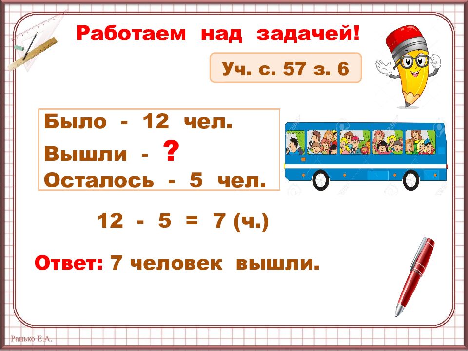 Уч. с. 57 з. 6 Ответ: 7 человек вышли. 12 - 5 = 7 (ч.) Было - 12 чел. Вышли - ? Осталось - 5 чел.