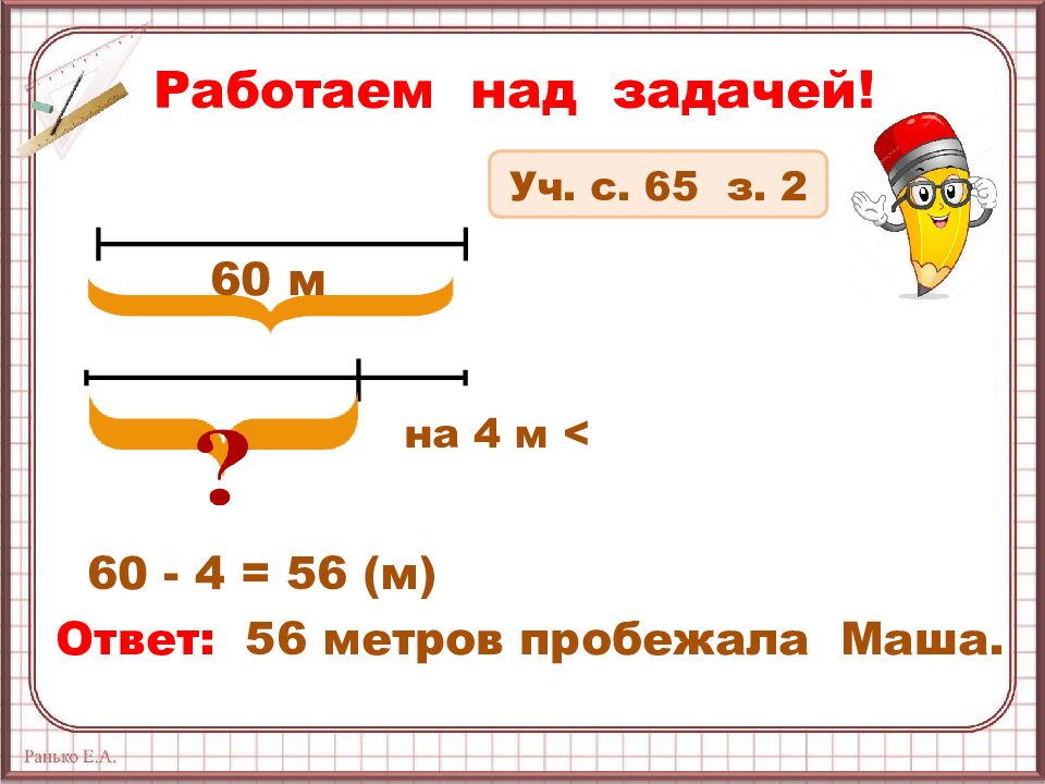 Уч. с. 65 з. 2 60 м на 4 м < 60 - 4 = 56 (м) Ответ: 56 метров пробежала Маша.