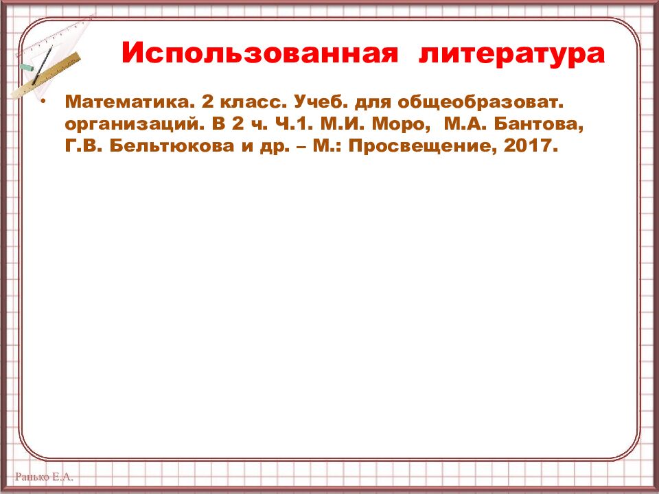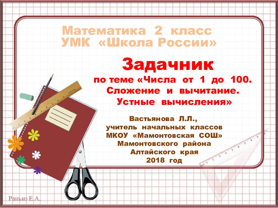 Математика 2 класс УМК «Школа России» Вастьянова Л.Л., учитель начальных классов МКОУ «Мамонтовская СОШ» Мамонтовского района Алтайского края 2018 год Задачник по теме «Числа от 1 до 100. Сложение и вычитание. Устные вычисления»
