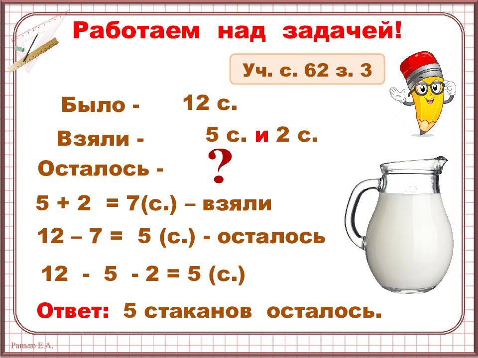 Уч. с. 62 з. 3 Было - Взяли - Ответ: 5 стаканов осталось. 5 + 2 = 7( с.) – взяли 12 – 7 = 5 (с.) - осталось 12 - 5 - 2 = 5 (с.) Осталось - 12 с. 5 с. и 2 с.
