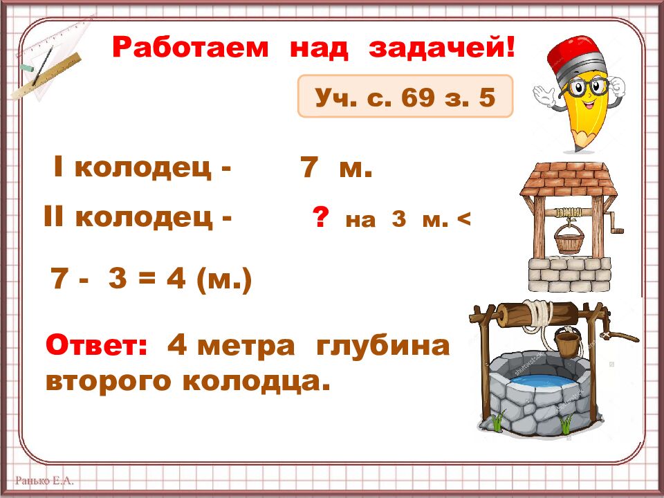 Уч. с. 69 з. 5 I колодец - II колодец - 7 м. ? на 3 м. < Ответ: 4 метра глубина второго колодца. 7 - 3 = 4 (м.)