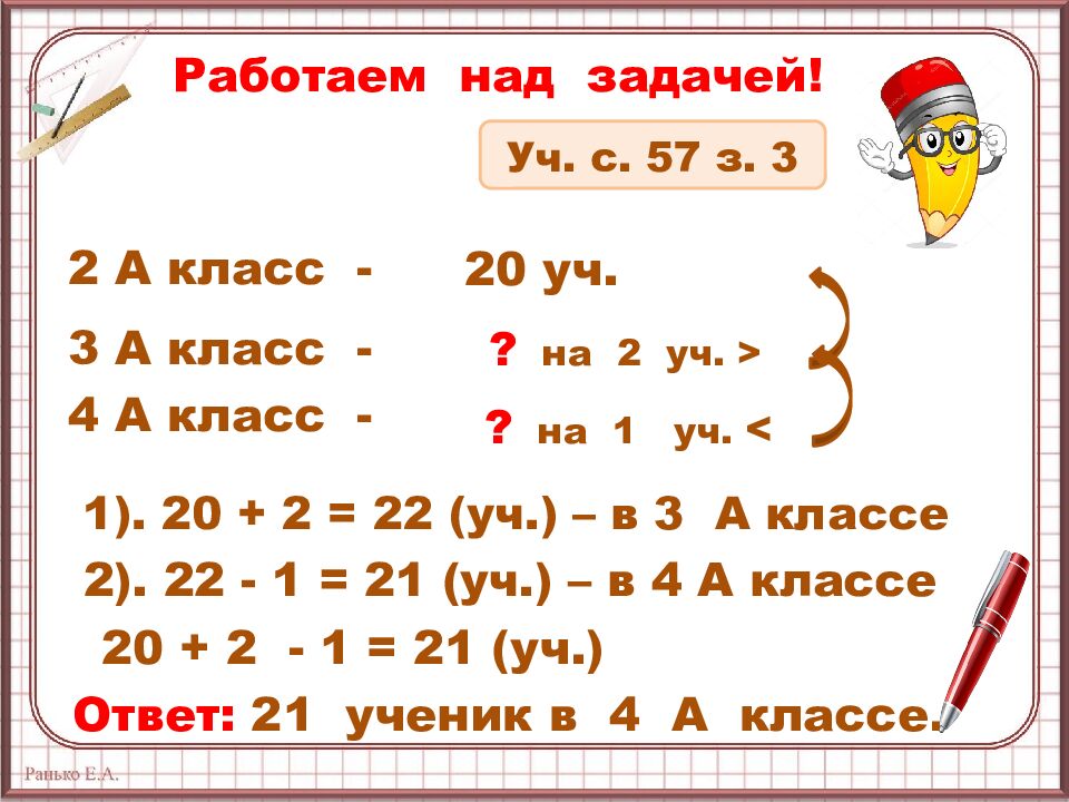 Уч. с. 57 з. 3 2 А класс - 3 А класс - 4 А класс - 20 уч. ? на 2 уч. > ? на 1 уч. < 1). 20 + 2 = 22 (уч.) – в 3 А классе 2 ). 22 - 1 = 21 (уч.) – в 4 А классе 20 + 2 - 1 = 21 (уч.) Ответ: 21 ученик в 4 А классе.