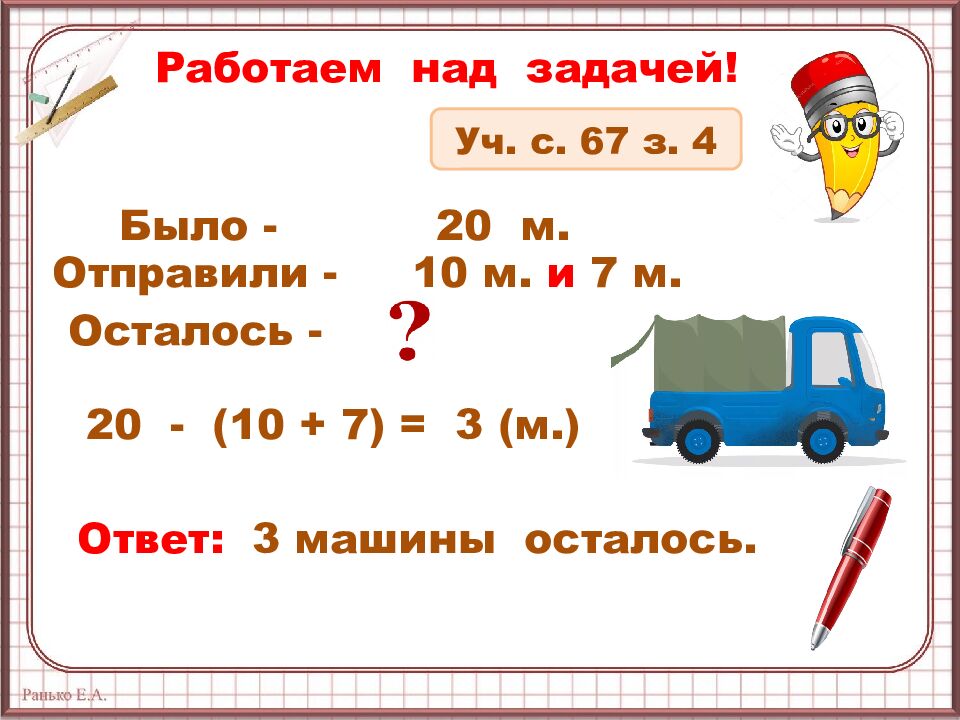 Уч. с. 67 з. 4 Ответ: 3 машины осталось. Было - Отправили - Осталось - 20 м. 10 м. и 7 м. 20 - (10 + 7) = 3 (м.)