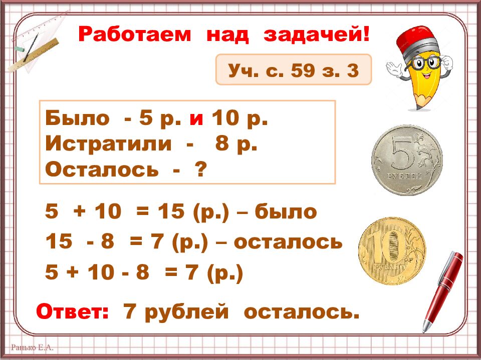 Уч. с. 59 з. 3 Ответ: 7 рублей осталось. 5 + 10 = 15 ( р.) – было Было - 5 р. и 10 р. Истрати ли - 8 р. Осталось - ? 15 - 8 = 7 ( р.) – осталось 5 + 10 - 8 = 7 ( р.)
