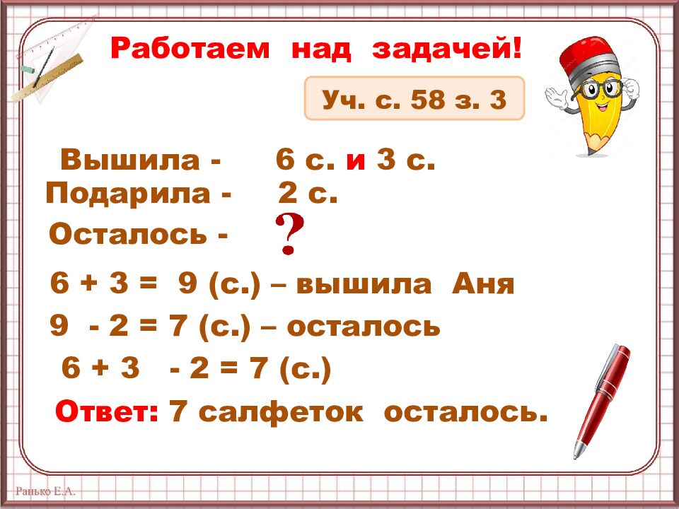 Уч. с. 58 з. 3 Ответ: 7 салфеток осталось. 6 + 3 = 9 (с.) – вышила Аня Вышила - П одарила - Осталось - 6 с. и 3 с. 2 с. 9 - 2 = 7 (с.) – осталось 6 + 3 - 2 = 7 (с.)