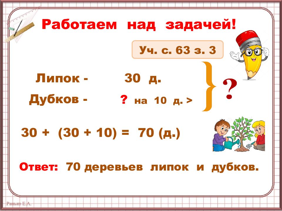 Уч. с. 63 з. 3 Липок - Дубков - 30 д. Ответ: 70 деревьев липок и дубков. 30 + (30 + 10) = 70 (д.) ? на 10 д. >