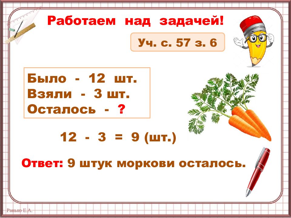 Уч. с. 57 з. 6 Ответ: 9 штук моркови осталось. 12 - 3 = 9 (шт.) Было - 12 шт. Взяли - 3 шт. Осталось - ?