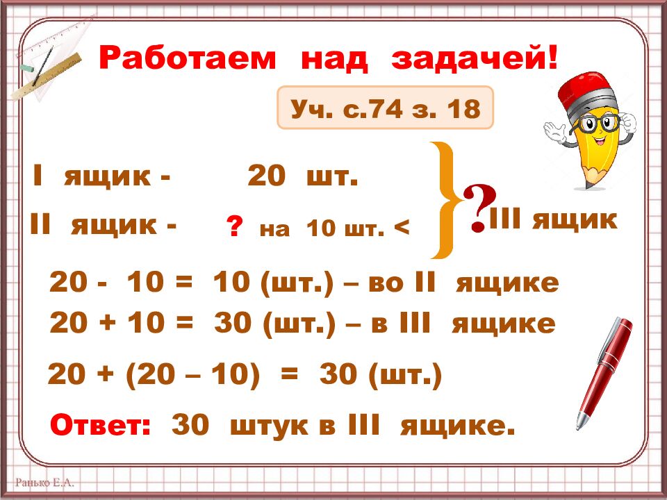 Уч. с.74 з. 18 I ящик - II ящик - 20 шт. Ответ: 30 штук в III ящике. 20 - 10 = 10 (шт.) – во II ящике ? на 10 шт. < II I ящик 20 + 10 = 3 0 (шт.) – в III ящике 20 + (20 – 10) = 3 0 (шт.)