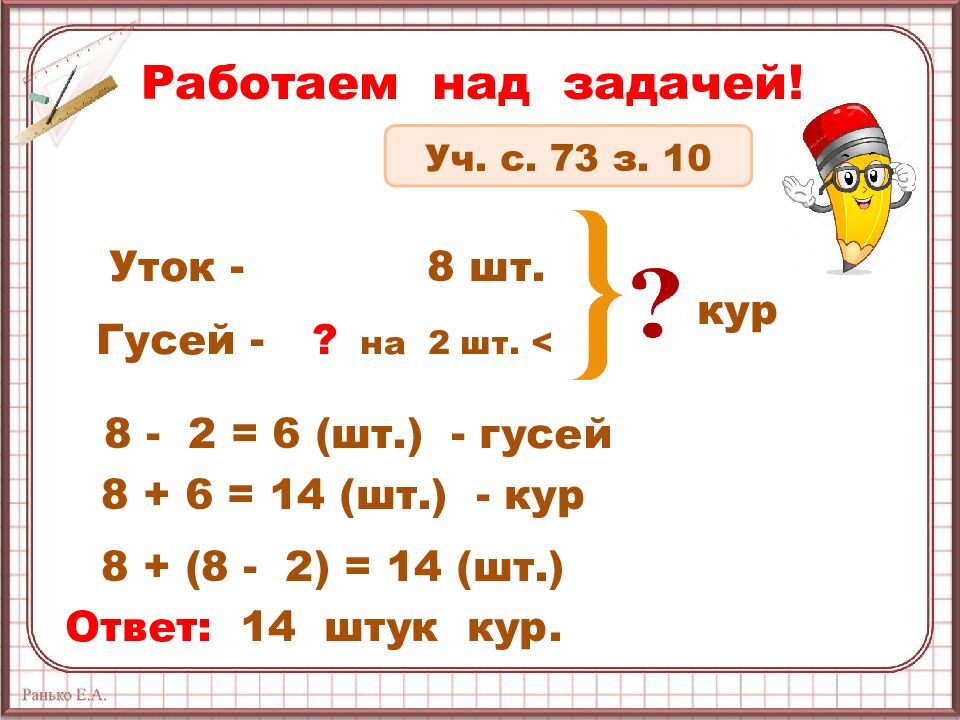 Уч. с. 73 з. 10 Уток - Гусей - 8 шт. Ответ: 14 штук кур. 8 - 2 = 6 ( шт. ) - гусей кур ? на 2 шт. < 8 + 6 = 14 ( шт. ) - кур 8 + (8 - 2) = 14 ( шт. )