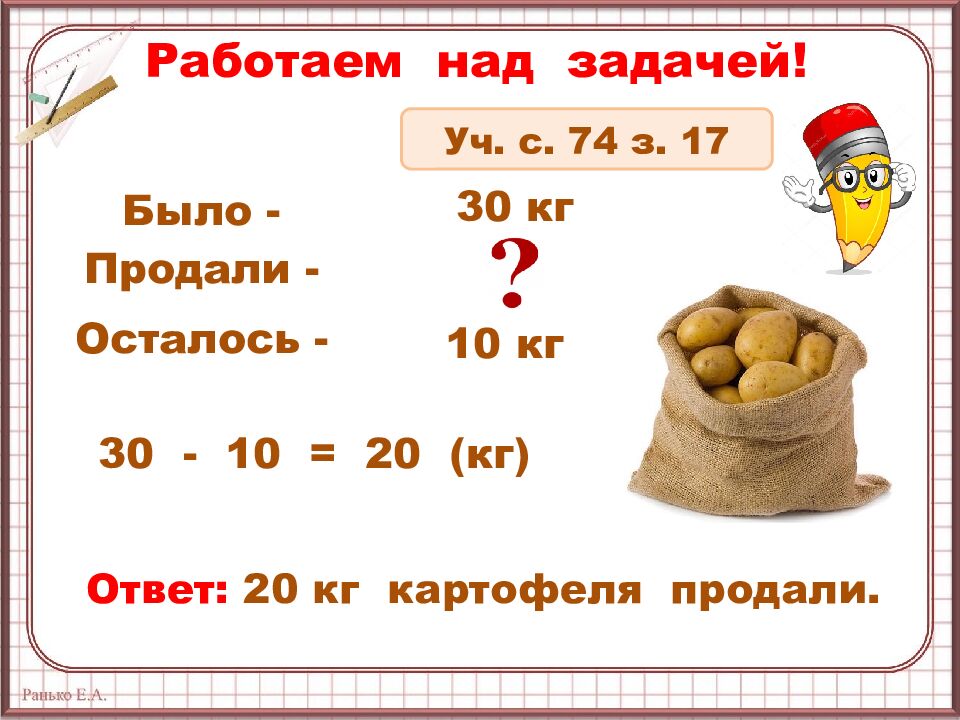 Уч. с. 74 з. 17 Было - Продали - Ответ: 20 кг картофеля продали. 3 0 - 10 = 20 ( кг ) Осталось - 30 кг 10 кг