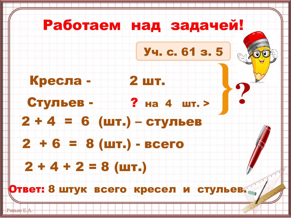 Уч. с. 61 з. 5 Кресла - С тульев - 2 шт. ? на 4 шт. > Ответ: 8 штук всего кресел и стульев. 2 + 4 = 6 (шт.) – стульев 2 + 6 = 8 (шт.) - всего 2 + 4 + 2 = 8 (шт.)