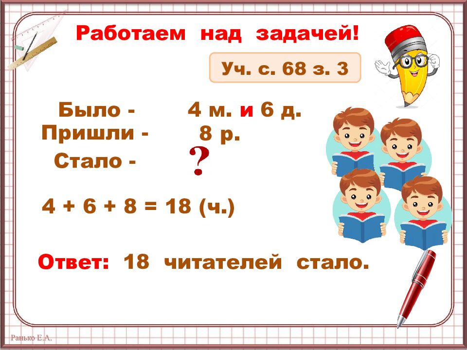 Уч. с. 68 з. 3 Ответ: 18 читателей стало. Было - Приш ли - С тало - 4 м. и 6 д. 8 р. 4 + 6 + 8 = 18 (ч.)