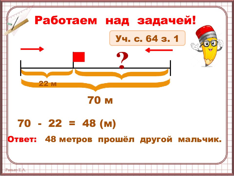 Уч. с. 64 з. 1 Ответ: 48 метров прошёл другой мальчик. 70 - 22 = 48 ( м ) 7 0 м 22 м