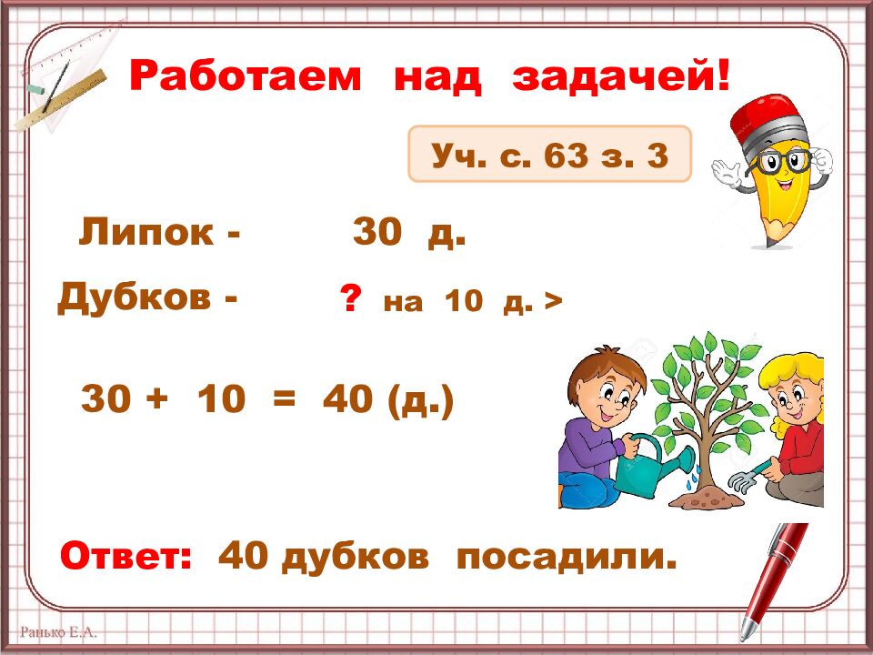 Уч. с. 63 з. 3 Липок - Дубков - 30 д. Ответ: 40 дубков посадили. 30 + 10 = 40 (д.) ? на 10 д. >